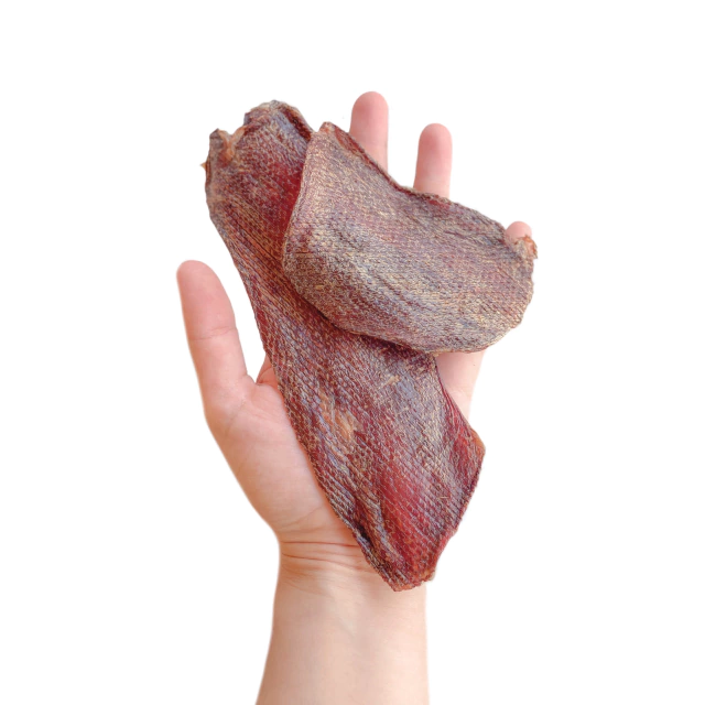 Petisco 100% natural, feito com ingrediente de origem animal e desidratado lentamente em temperatura controlada garantindo maior durabilidade e conservação do produto sem uso de químicos.